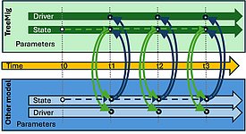 Das TreeMig-R-Paket stellt Funktionen zur Verfügung (aktuell in CoupleOtherModelToTreeMig.R in den Beispiel-Skripten), um die Kopplung von einem anderen Modell (AM) an TreeMig (TM) zu vereinfachen. Die Kopplungsfunktion iteriert durch vordefinierte Kopplungs-Zeitpunkte (KZP, kleinst-möglicher Abstand 1 Jahr) der Gesamtsimulation. Zwischen den KZP laufen beide Modelle unabhängig voneinander. An den KZP tauschen TM und AM Daten über Zustand und Eingangsdaten aus. Das AM modifiziert Anfangswerte und/oder Eingangsdaten von TM.