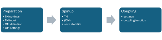 Zu Beginn der Kopplung müssen die Zustände, Settings und Inputdaten von TM bekannt sein. Das kann durch eine Spinup-Simulation, z.B. mit einem TM-R-Skript erreicht werden.